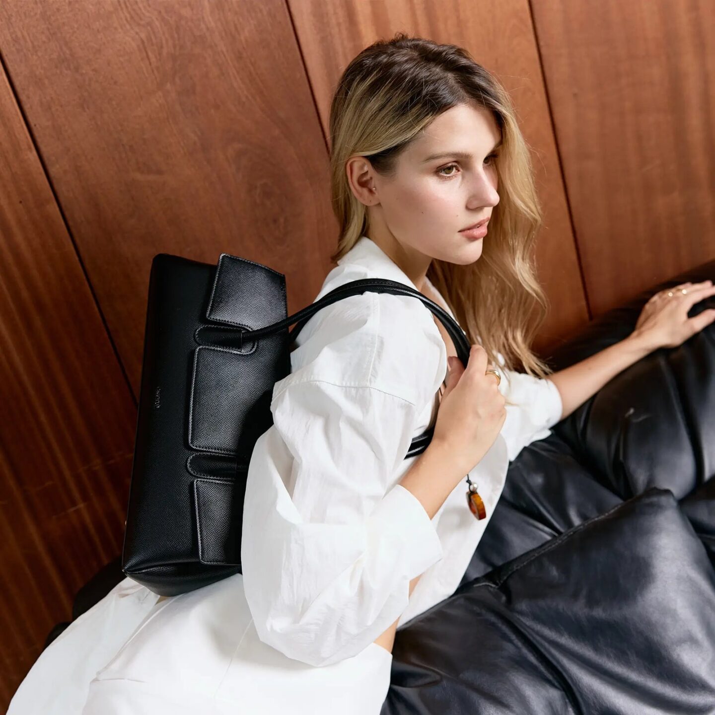 I’m really drawn to the Ambre Shoulder Bag in Tan. The elegant silhouette and medium size make it the kind of bag that works for everything from a gallery opening to an afternoon full of errands.